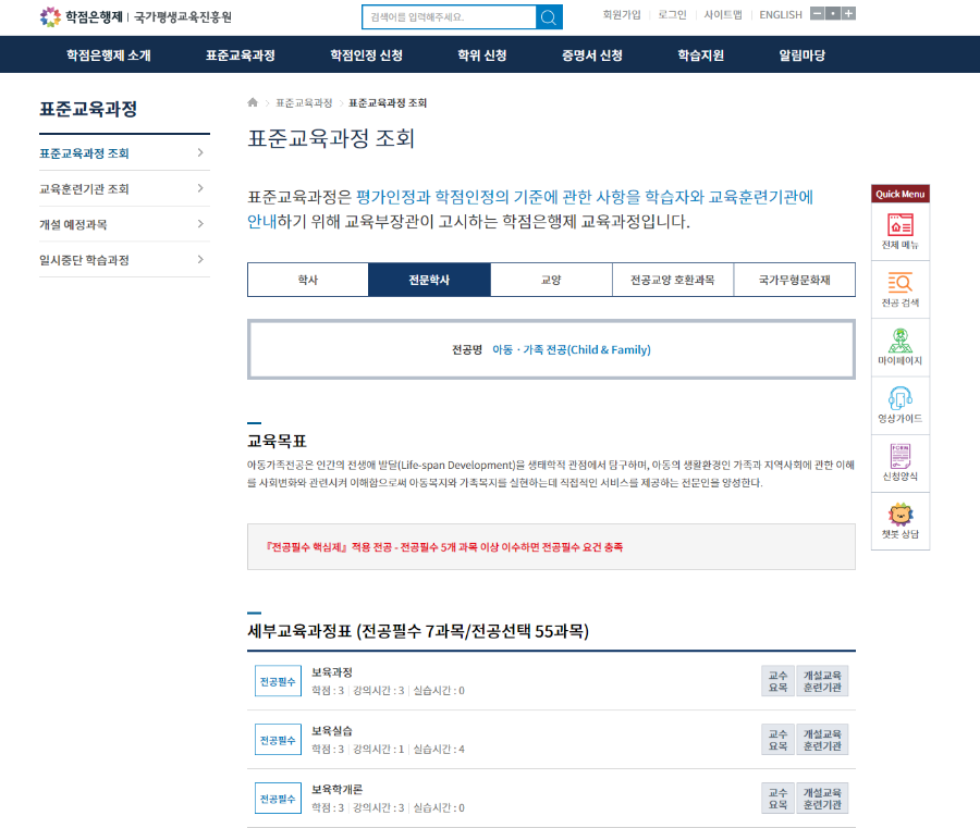 표준교육과정 전문학사> 아동·가족 전공> 전공필수 7과목과 전공선택 55과목 검색됩니다. 전공 신청으로 바로가기하시려면 참고하십시오. 이수 과목 확인하고 신청, 이수하면 됩니다. 과목의 교수요목이나 개설교육훈련기관도 확인할 수 있습니다.